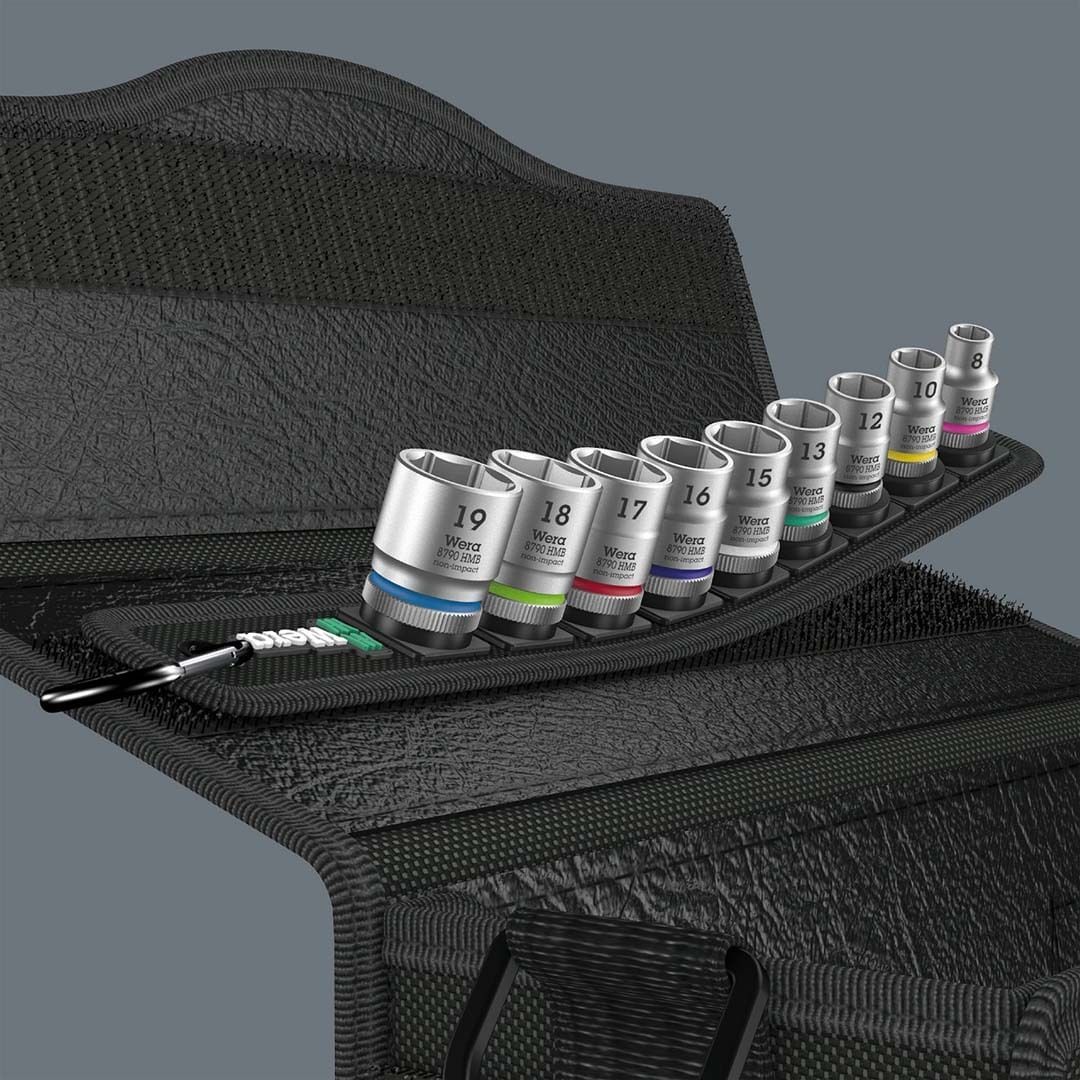 Typically Wera designed robust textile belt with 9 sockets taking up minimal space. A smooth turning Twist to Unlock mechanism ensures a secure fit and simple removal of the sockets. Comes with quote;Take it easy quote; Tool Finder with color coding according to size to enable the right tool to be selected easily and quickly. Includes a snap hook for secure fastening to a belt loop or pocket. Supplied with a non-woven reverse side and hook and loop strips for simple attachment e.g. to a wall, shelf, tool trolley and to the Wera 2go tool transport system.