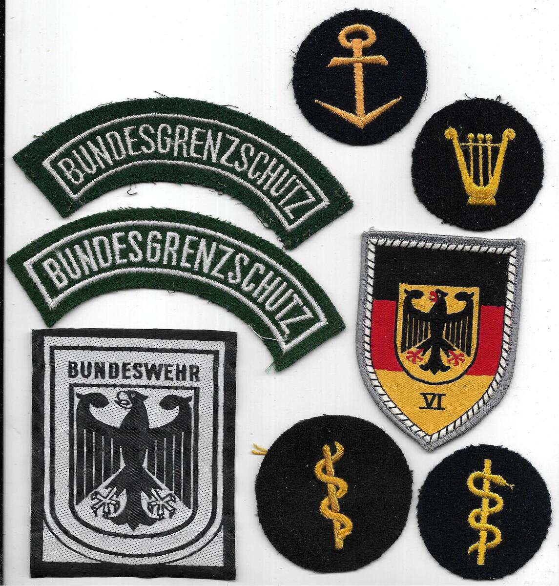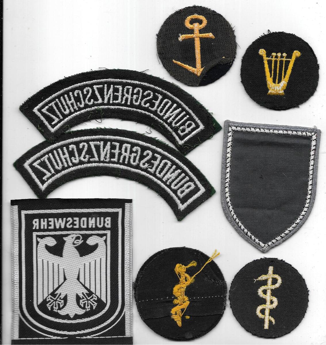 Mostly NOS or vintage unused pieces, a few could be used. They came together when I bought them and I don't see much to be gained separating them so here they are. There is one b w general patch for the Bundeswehr, another with a similar insignia in color and the Roman numeral VI which is for Wehrbereichskommandos, two tabs for the Bundesgrenschutz who are border security, and then there are some small round Naval ratings on felt which are pretty self-explanatory.