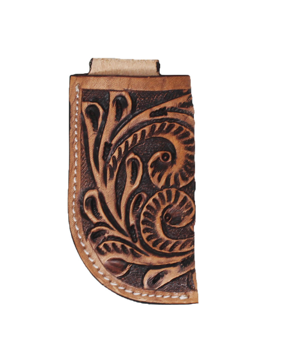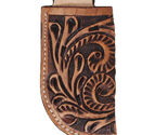 Keep your favorite knife close with this Challenger handcrafted full-grain top quality leather belt sheath. Made to endure everyday use for years to come. This knife holder comes accented with a hand-tooled antique floral design on tan leather. Sheath measures approximately 4-1/4" x 4-1/8".