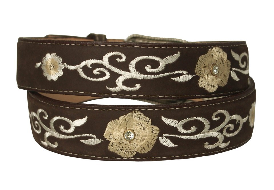 Western Cowboy Belt Dark Brown Leather Removable Buckle Floral Embroidered Rodeo