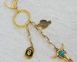 Channel the wild west with this gold-tone bag charm featuring a turquoise-accented bull skull, cowboy hat, and cactus. Designed with a trendy chain detail and secure clasp, it?s the perfect accent for bags, keys, or backpacks with a western flair.
