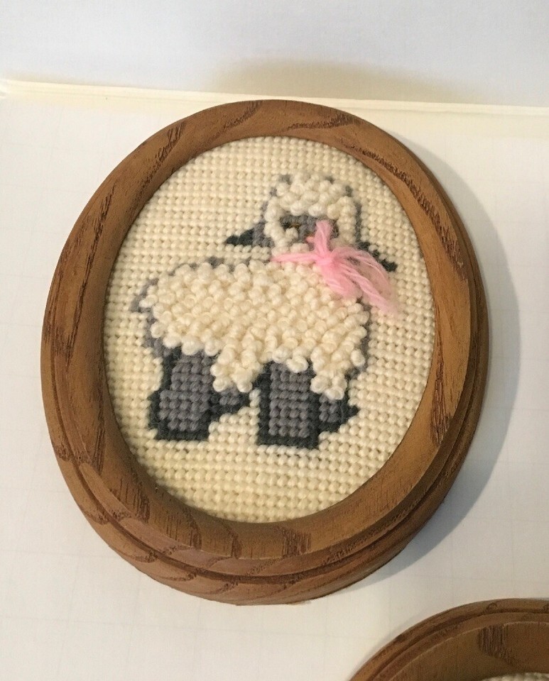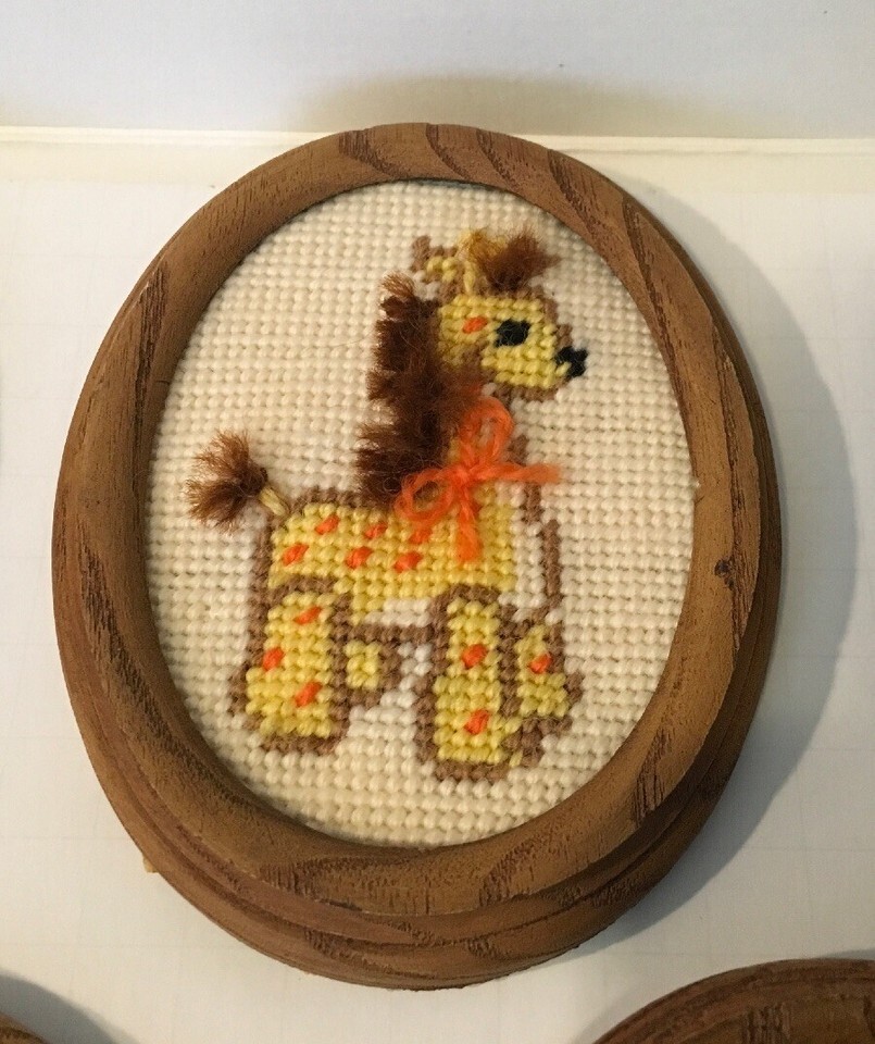 Whimsical Needlepoint Animals Oval Frames (4). Each measures 5x4 inches. A pink kangaroo, a blue horse, a giraffe and a sheep with a pink bow form this set. Good condition, wooden oval frames. The horse frame does have a crack in it.