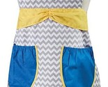 Gray and White chevron apron embroidered with Whip It Good on the front. Yellow bow with blue pockets trimmed in yellow, a yellow waist band and yellow ruffles. Plus three small hearts, a yellow pot and a whisk. One size fits most women. 100% cotton