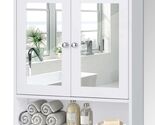 White Bathroom Wall Medicine Cabinet with Mirror and Open Shelf Brand new and high quality Mirrored interior Sturdy and durable MDF wood Space saving Assembly required and hardware included Color: White Material: MDF Door style: Double framed mirror Mounting type: Surface wall mount Package includes: 1 x bathroom wall cabinet Multi-function Use This wall-mounted cabinet is ideal for a bathroom, bedroom, living room or kitchen It features an enclosed shelf with double mirror doors, and one open shelf to place towels, soap, tissues, and other decorative items In addition, you can also put some green small plants on the open shelf to make your item neat and beautiful