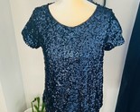 This is a GORGEOUS midnight blue sequin top. Ballet neck, short sleeves.