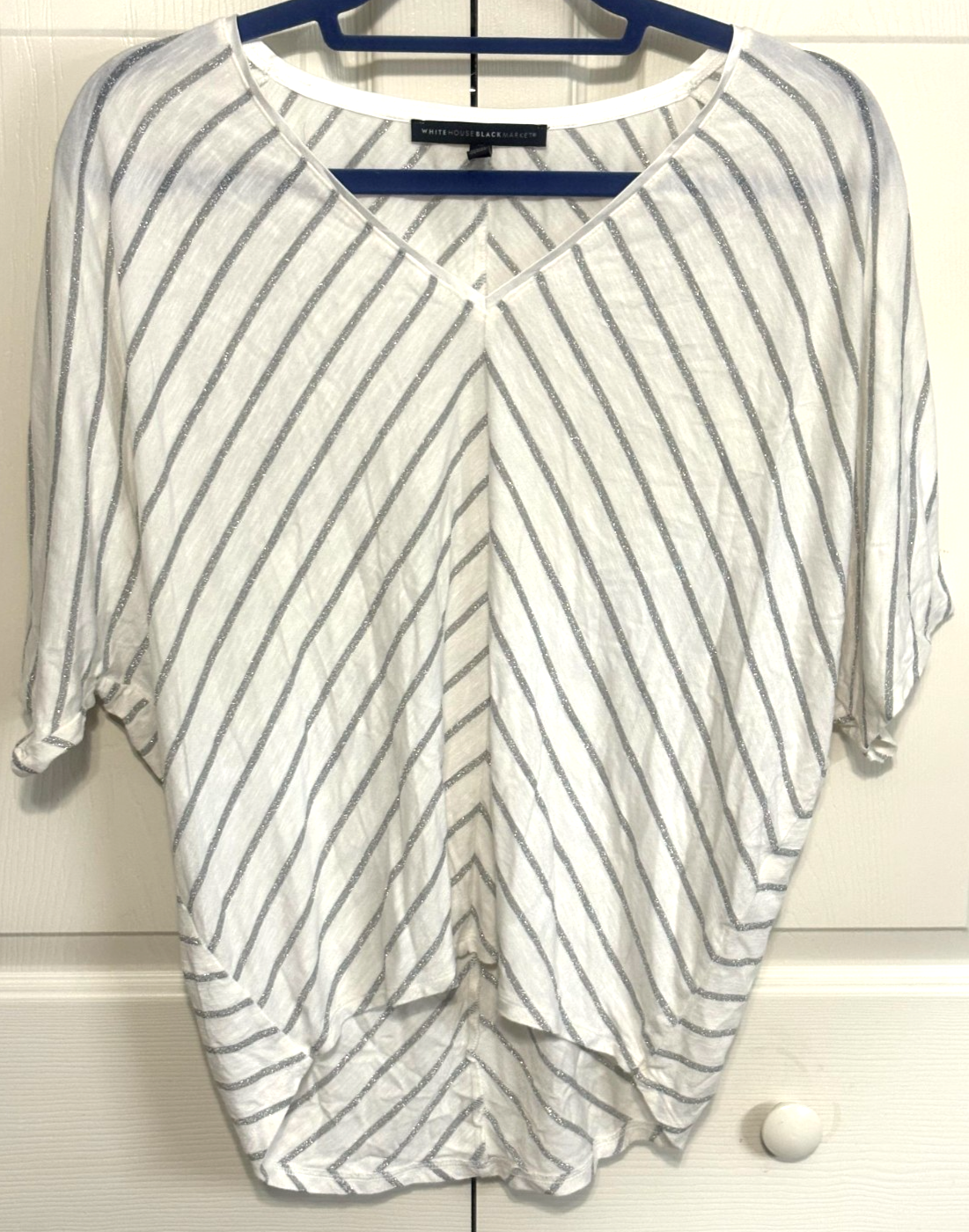 White House Black Market S White Sparkling Silver Stripes Womens Shirt Top
