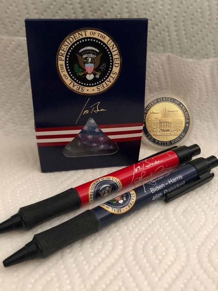WHITE HOUSE CHALLENGE COIN COBALT BLUE PEN WITH HOUSE OF THE PRESIDENT WASHINGTON in SILVER?COIN COMES IN CLEAR PLASTIC CONTAINER?VERY ELEGANT REFILLABLE PEN MAKES A GREAT GIFT FOR ANYONE...COMES IN CLEAR PLASTIC CASE..LAST 12 PHOTOS ARE TO SHOW OTHER ITEMS NOW LISTED?AUCTION IS FOR ONLY WHITE HOUSE COIN PEN IN FIRST PHOTO. IN EXCELLENT NEW CONDITION...GREAT COLLECTIBLE PRESIDENTIAL ITEM..MY OTHER LISTINGS-OFFER MANY WHITE HOUSE PRESIDENT ITEMS FOR LINCOLN ROOSEVELT REAGAN BUSH CLINTON BUSH OBAMA TRUMP BIDEN?.SAVE ON POSTAGE WITH MULTIPLE PURCHASES BY ASKING SELLER FOR INVOICE TO COMBINE PURCHASES-WITH ONE SHIPPING FEE FOR ALL SENT TOGETHER.. ..DO THIS BEFORE YOU PAY FOR AN ITEM?.