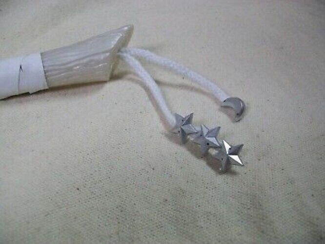 Pearl White Mystic Wand. Molded Plastic. Crooked. Textured to look like a twig. Has 2 small pieces of rope that is accented with small plastic moons and stars. For ages 8 and up. Unisex: Could be used with Male or Female themed Costumes.