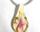 - WHITE w BRONZE SHIMMER & PINK FLOWER GLASS PENDANT WHITE SUEDE CORD NECKLACE