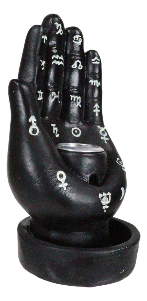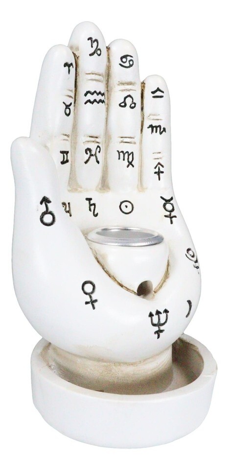 ? Sculpted in a manner that conjures images of readings in old French Salons, cryptic constellations, celestial symbols, ancient Hamsa religion or a hidden gypsy caravan, this Palmistry Hand is a true delight. We add a bonus feature to the sculpture as a backflow cone incense burner. When lit, trails of smoke will cascade down the hole on the palm.