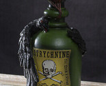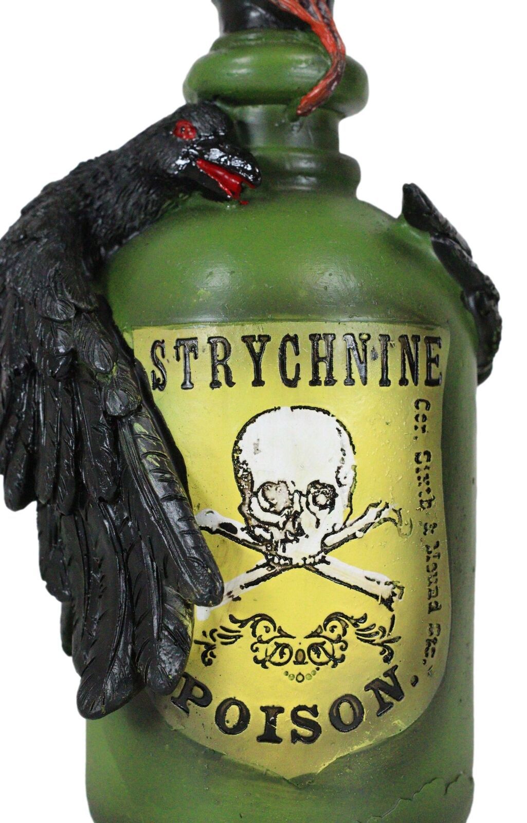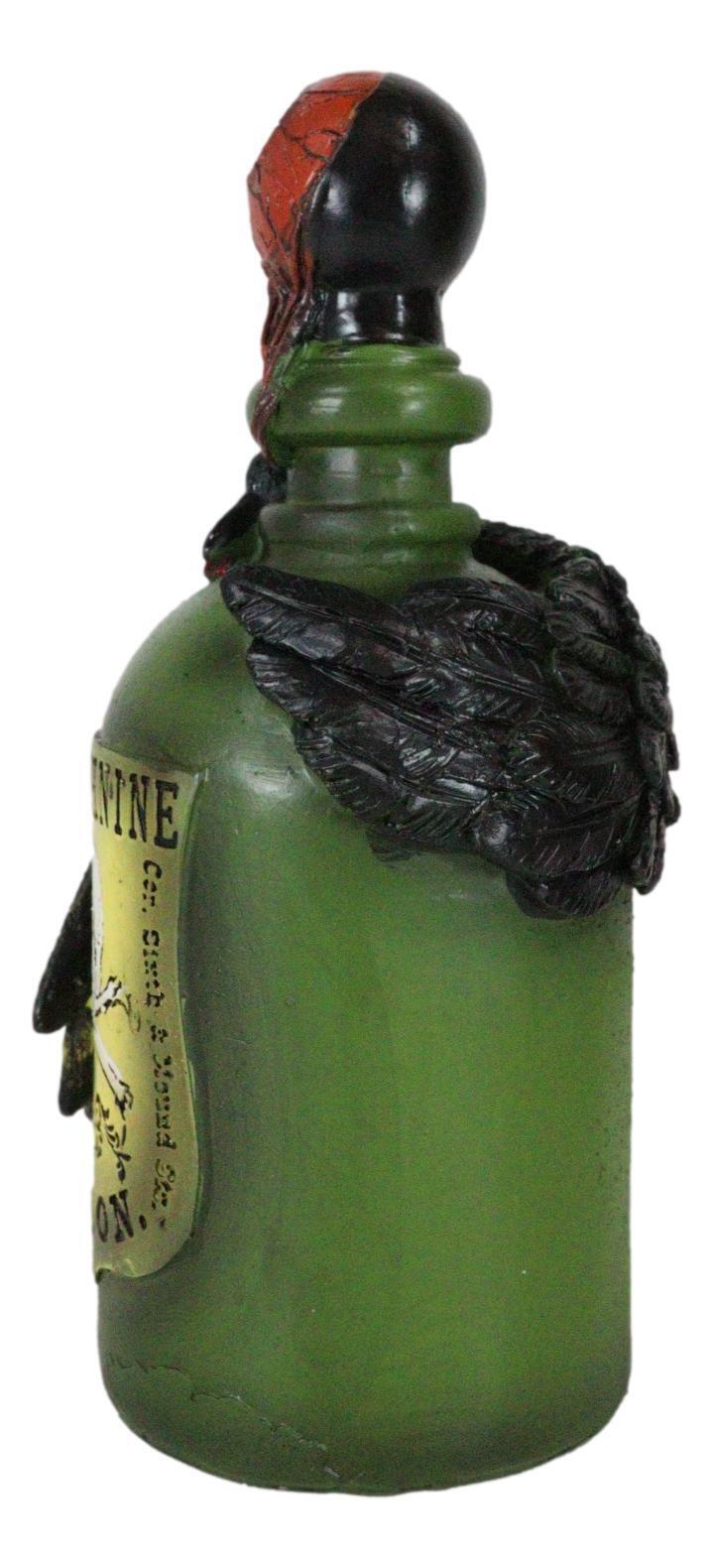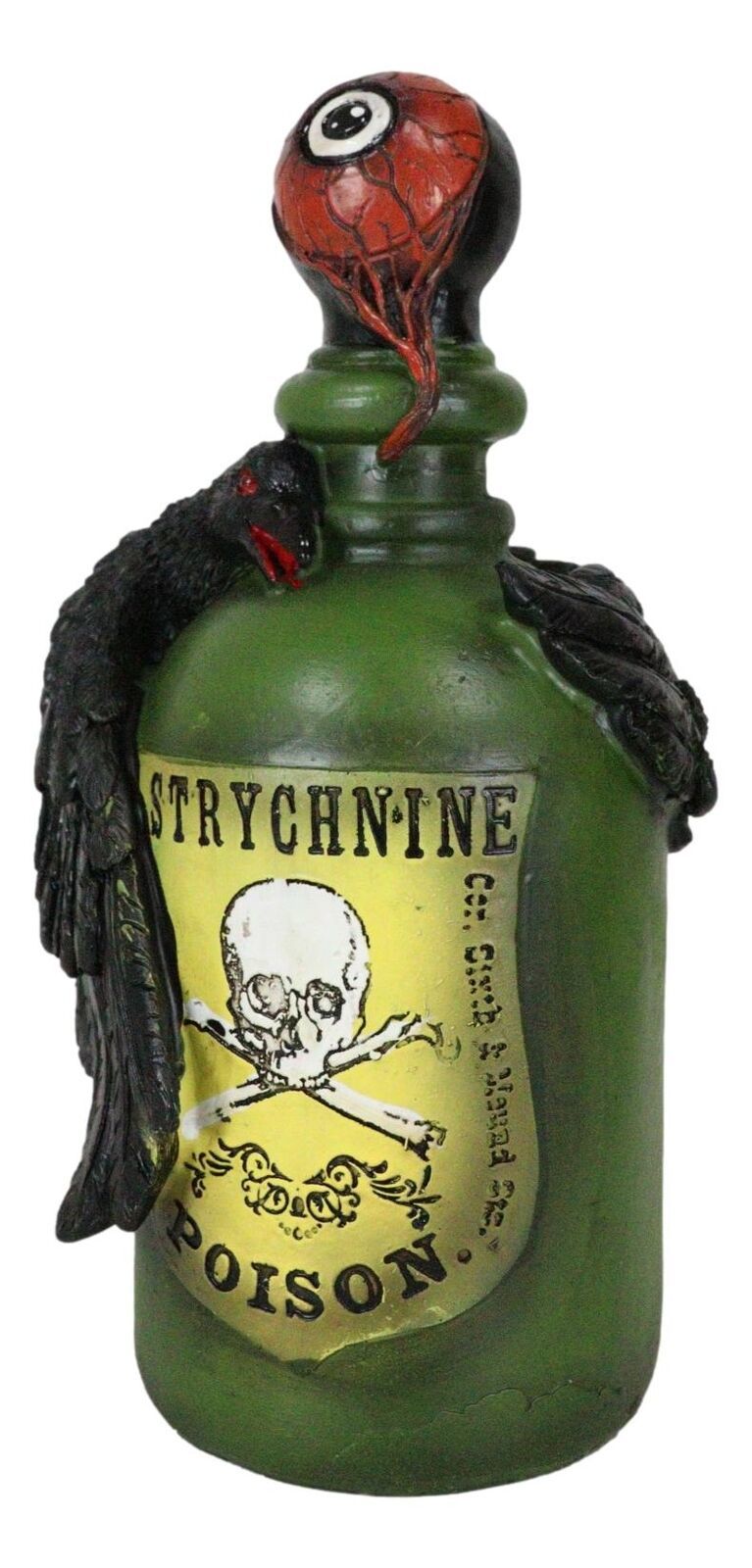 ? A symbol of black magic and death itself, the black raven unleashes its potency with this faux potion bottle decor. This faux potion bottle looks like a prized possession taken off of a Grand High Witch's apothecary. Starting with a red bloodshot eyeball lid, a dead raven perches on the bottle and the label of strychnine, poison and crossed skull at the center.