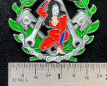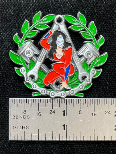Widows Sons MRA ?Past State/Grand Chapter President? pin, with the original Widow overlaid on top of a set of pistons and wrenches positioned in the shape of the Masonic Square and Compasses, with a section of bike chain underneath and laurels surrounding them to symbolize having served as a State or Grand Chapter President.
