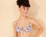 Underwire bikini top from Wild Fable in white with red and pink floral print. Made from nylon with spandex and recycled polyester lining for stretchy comfort in and out of the water. Removable cups offer customizable coverage, while adjustable straps make it easy to find the right fit. Front tie detail finishes off the chic look.