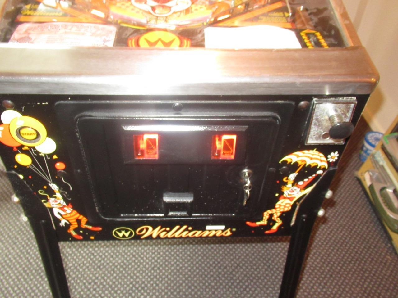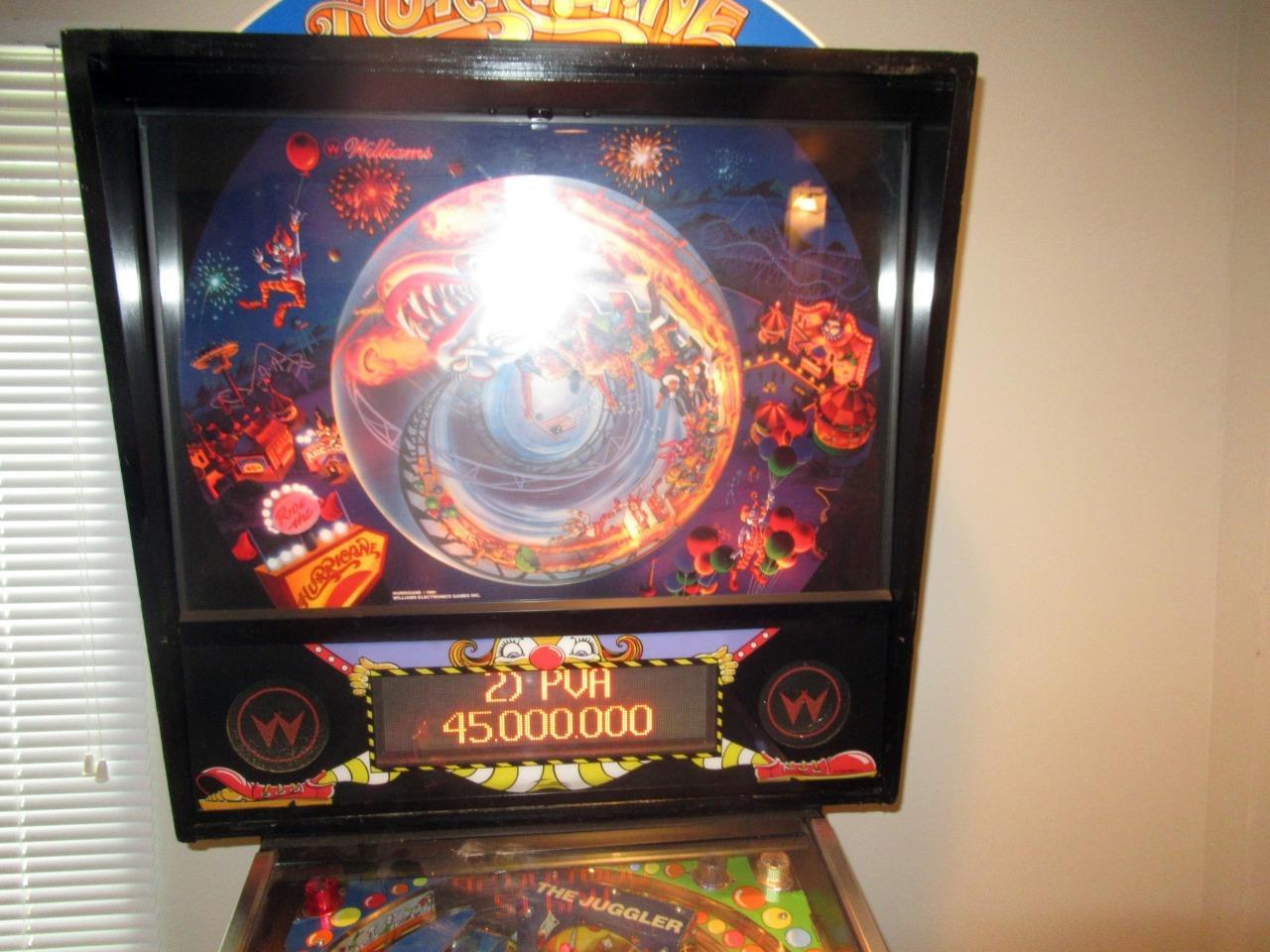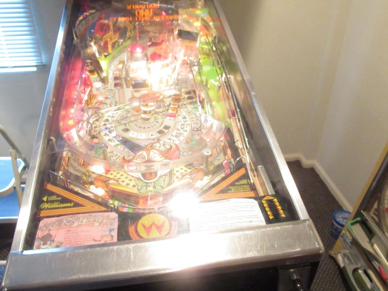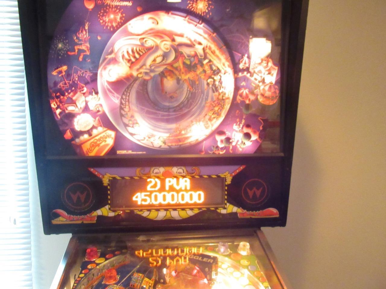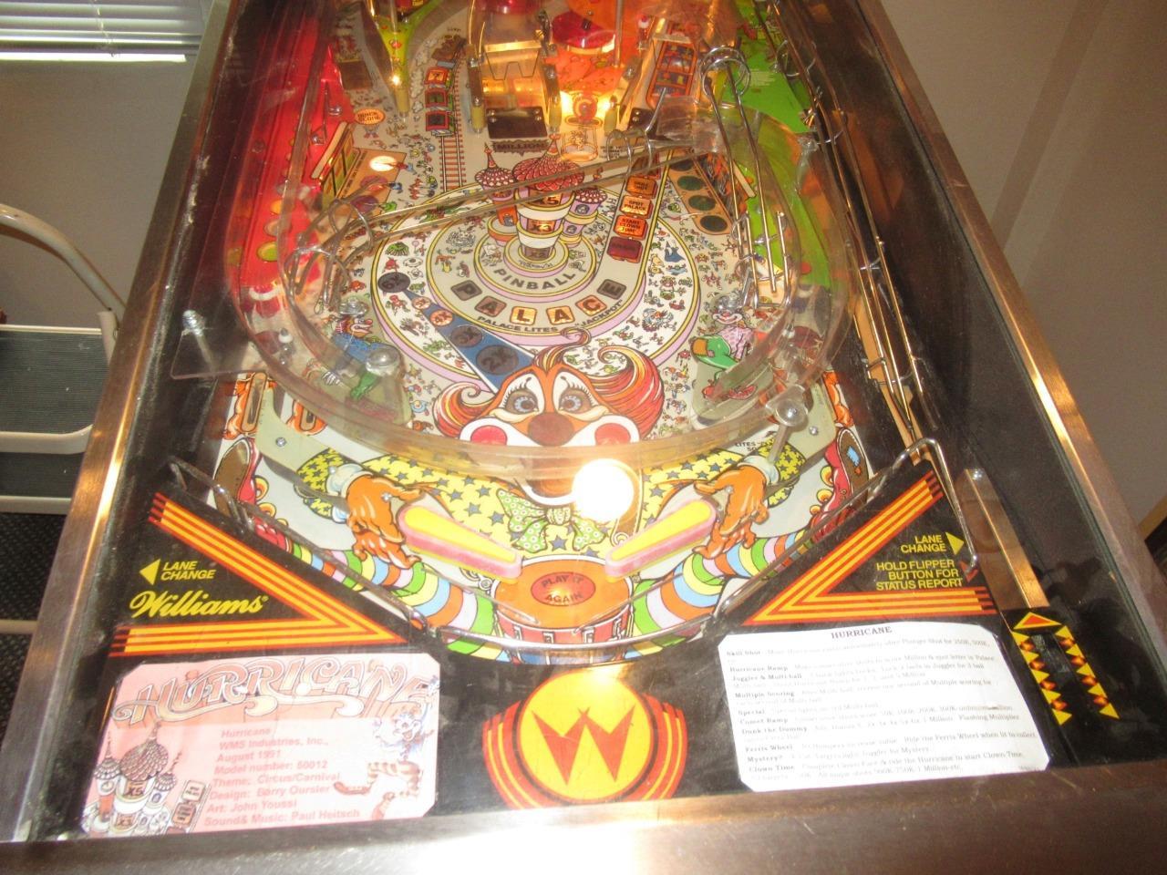 This is a Vintage Williams 'Hurricane' Pinball machine. This pinball machine was manufactured by Williams in 1991. Hurricane is a fun packed carnival themed pinball. This pinball machine was manufactured by Williams in 1991. Hurtle around on the roller coaster to build up to 1 million points and spot a letter in PALACE to put you on your way to lighting the Jolly Juggler for a jackpot. Hurricane features a dazzling dot matrix, pie-in-the-face antics and plenty of scoring opportunities, and there is even a revolving backglass wheel. Game features: Comet ? score unlimited millions Dunking the Dummy ? make a big splash and advance the Bonus Multiplier Double Ferris Wheel ? for bonuses and Quick Score Cat targets ? lights the Juggler for a Mystery Score on the Backglass Wheel 2 or 3 ball Multi-Ball Machine is out of my personal collection and plays fine. Has some paperwork also Must be picked up