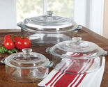 This set features three essential sizes?1-quart, 2-quart, and 3-quart?crafted from thick, clear glass that ensures a beautiful presentation for your side dishes, entrees, and desserts. The naturally nonporous surface resists stains and scratches, maintaining a smooth, easy-to-clean finish that stands up to everyday use. With lids that lock in moisture and flavor, your meals stay fresh and warm, whether you're baking in the oven or serving at the table.