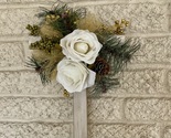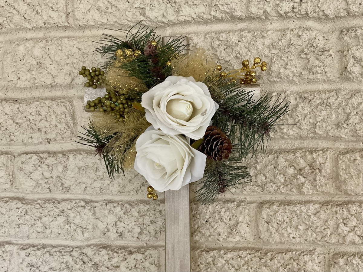 This 18” pine cemetery cross has been painted a metallic color with two large off white roses, layers of snow covered fir branches, bright gold glitter berries, green berry branch, a pine cone, and glitter gold tulle. The cross has a pointed end for easy ground insertion. Every cross is sprayed with a coat of clear polyurethane to protect the ribbon and silk flowers from outdoor elements.