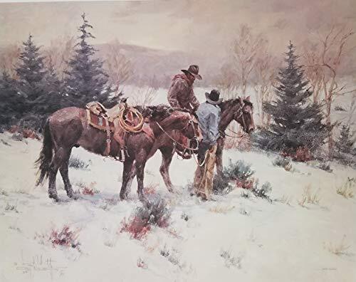 Product description: Winter in the Vermejo is a signed and numbered limited edition print by Gary Niblett. This piece depicts two cowboys, stopped on the trail. You can almost feel the cold of the snow and wind. The image size is 22" x 27 1/2". Overall size is 26" x 31 1/2". It was published by Texas Art Press in 1979 in an edition size of 2,250. About the Artist: Gary Niblett was born and raised in Carlsbad, New Mexico. After graduation, he went on to California, where he attended the Art Center School of Design. He spent eight years with the Hanna-Barbera studios as a background artist, but continued to develop his own style. He met his wife, Monika, while working for the studios. They were married in 1970. In 1973 Gary left commercial art to focus exclusively on Western art, and three years later was voted into the CAA. He returned to New Mexico, where his work continued to gain national recognition. His work has been exhibited all over the world, including the Grand Palais, France, and the Amerika Hass Berlin, Germany. He also has exhibited in Moscow, Taiwan, Beijing, and at the prestigious Royal Watercolor Society in London. Niblett?s work has been included in publications such as the International Fine Art Collector, Time, Saturday Review and New Mexico Magazine. In 1990, he was honored as the Distinguished Calendar Artist for New Mexico Magazine, and is featured in a book titled Gary Niblett ? A New Look at the Old West. He has been given the honor of having a large oil hanging in the state capitol building in Santa Fe, New Mexico. Gary works mostly in oil, but says he is ?comfortable in watercolor.? His art demands that we look into the reveries and still moments of the human spirit where the heart lives. His versatile work demonstrates the human values, which are brought to bear in living, not only in the American West, but in the world.
