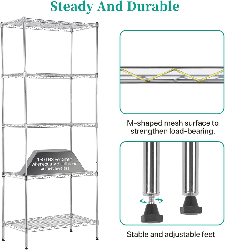 ??STURDY CONSTRUCTION?The storage shelves can hold up to 750 lbs weight. The wire shelving unit use durable steel construction, and to resist dirt buildup and corrosion. The metal shelf with sturdy posts and wire meshes enable the unit to hold up to 150 lbs of evenly distributed weight. Metal shelf storage shelves wire shelving unit