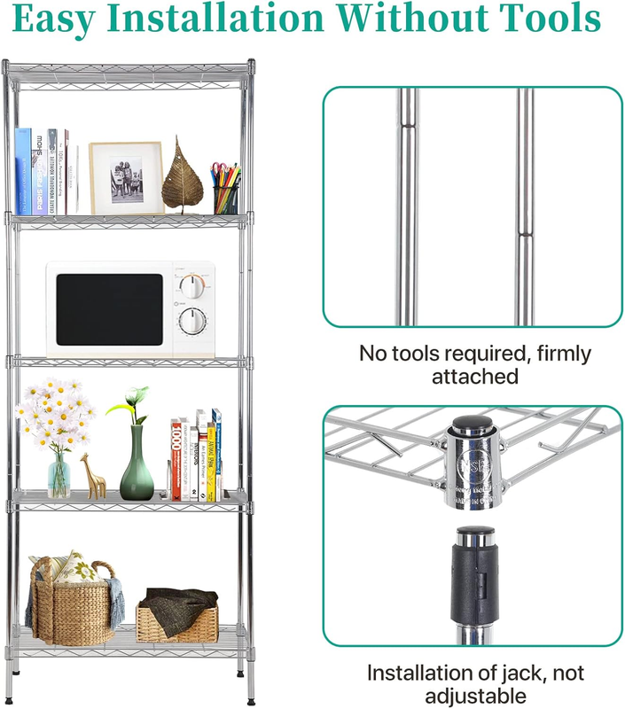 ??EASY TO ASSEMBLE?No tools required to install the storage shelves, simply snap clips onto the posts at the fixed height and then slide the metal shelf down the posts until they firmly rest on the clips, you only need to spend 10 minutes to install the wire shelving unit. Metal shelf storage shelves wire shelving unit