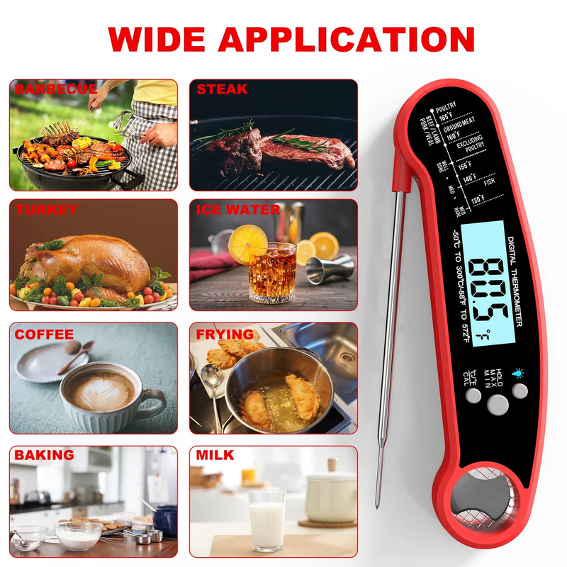 Accurate Reading Ultra Fast - Equipped with a food grade stainless long probe, thermometer takes the temperature in a little as 2 seconds and is accurate to 1C(1.8?) degrees with a wide range of -58?~572??-50C~300C). The food thermometer is perfect for indoor/outdoor cooking, grilling, BBQ and more. No matter what you're cooking, this instant read meat thermometer is the best assistant for you. Waterproof Design Durable Material - With professional IP67 rated waterproof design, the food thermometer can be washed under running water without fear! Incredible waterproof performance makes it easier to clean. What's more, the meat thermometer has a strong ABS plastic shell. Even if the thermometer is accidentally dropped or hit, it can be easily protected from serious damage. thermometer works with great durability and lasts longer than others. So easy to Use Multi Function - Works right out the box! The digital thermometer is pre-calibrated, so you don't need to calibrate by yourself. With Auto On/Off function, you can unfold the probe to turn on or fold to turn off. Press the button to switch the temperature between Centigrade and Fahrenheit. The digital meat thermometer not only comes with a large digital LCD backlight screen, but also has Hold Button which lets you see the temp easier. Easy Storage Built-in Magnet - The instant read thermometer has built-in magnet and a hanging hole with bottle opener function. After cooking finished, you can either hook the food thermometer to the wall or attach its magnetic back to the refrigerator or oven within your reach. The meat thermometer is easy to store. Whether refrigerator, oven, kitchen hook or other places, it can be easily stored wherever you want. Safe to Use Lifetime Warranty - Team provides all of our customer's high-quality products and professional after-sales service. If you have any problems, please feel free to reach to us and one-click "contact the seller". We will be here for you 24-7-365. instant read food thermometer makes an essential for your kitchen gadget. Order now and say hello to perfectly cooked steak, turkey or BBQ.