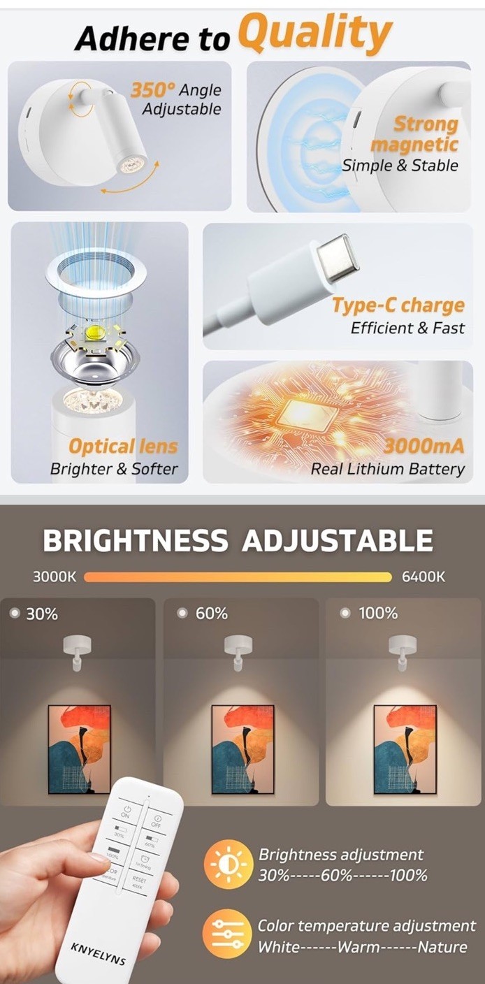 The Wireless Spot Lights Indoor (2 Pack) by KNYELYNS are versatile uplights designed for indoor use. With a sleek white design, these rechargeable spotlights offer convenient wireless functionality and the ability to adjust the lighting with the included remote. Perfect for illuminating dark areas or adding ambiance to any room, these spotlights provide stylish and customizable lighting solutions for your home.