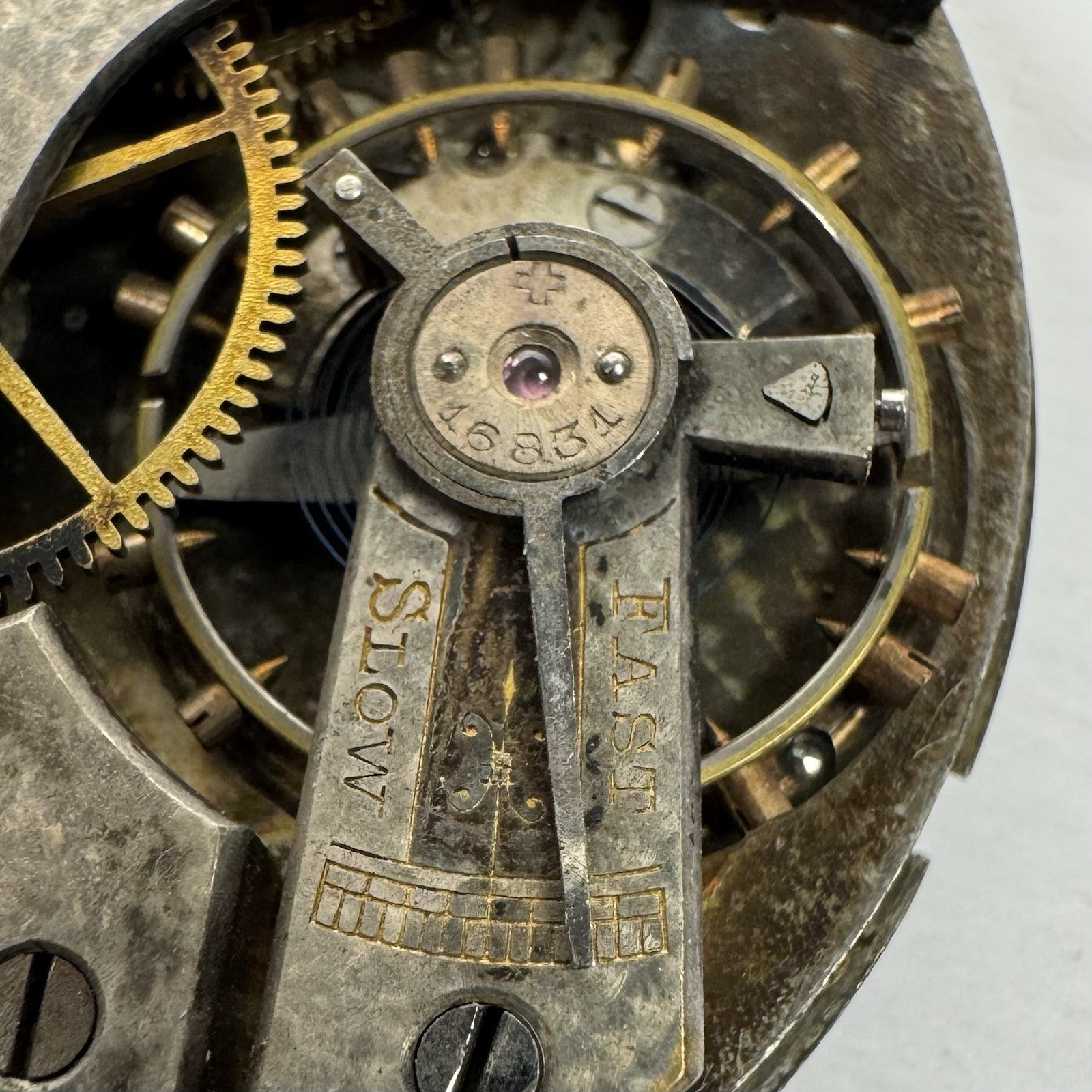 This pocket watch movement is being sold for parts as is exactly as shown in the photos. See pictures for more details.