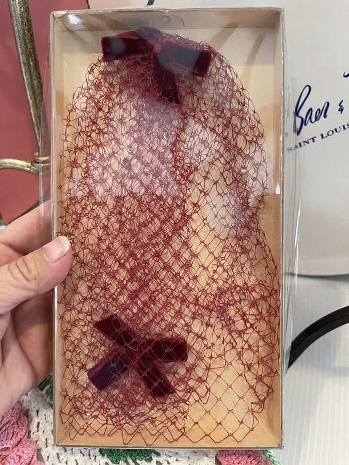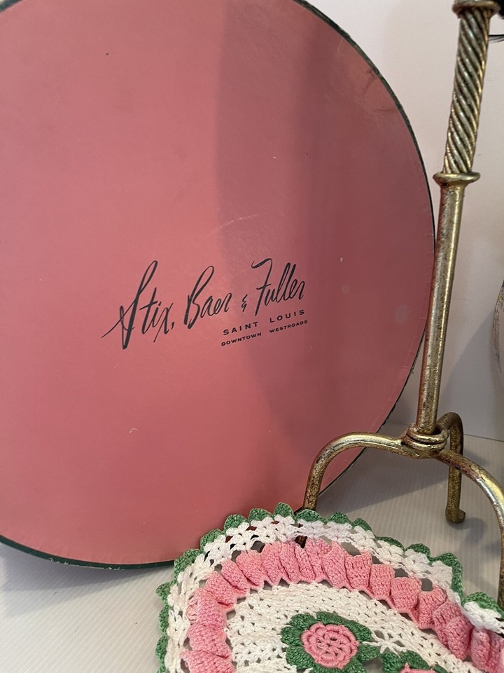 White Fax Mink, Red Ribbon with Diamond hat button. winter Hat labeled Wm Silverwan New York from French Room Stix Baer Fuller with Hatbox and Stand.(Candle Stand)