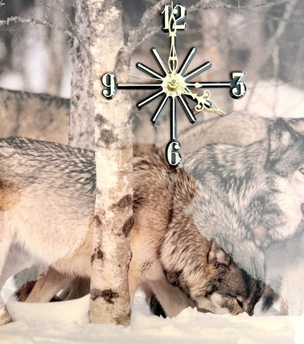 - Wolf Pack In Snow Clock Coated Photo On Wood 1993 Vintage Tested Works SS