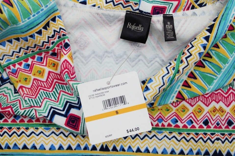 The Women Top Geometric Print Short Sleeve Blouse in size S in Paradise Pink is a stylish and versatile addition to any woman's wardrobe. Made from a comfortable blend of polyester and spandex, this blouse features a geometric pattern, short sleeves, a round neck, and a pullover closure. With a regular fit and basic style, it is perfect for everyday wear and can be dressed up or down for various occasions. The multicolor design adds a fun and vibrant touch to any outfit, making it a must-have for fashion-forward women.