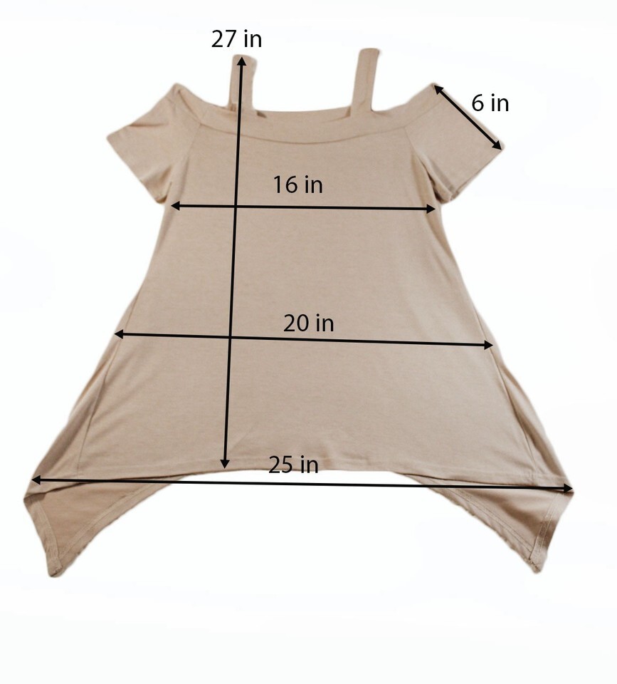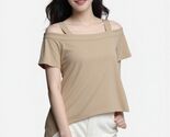 This brown off-the-shoulder top combines style and comfort with its short sleeves and relaxed fit. Featuring two delicate shoulder straps for added support, it showcases an asymmetrical hem with extended points at the sides, creating a modern, dynamic silhouette. Crafted from soft fabric, this piece offers a refined texture that enhances wearability and elegance.