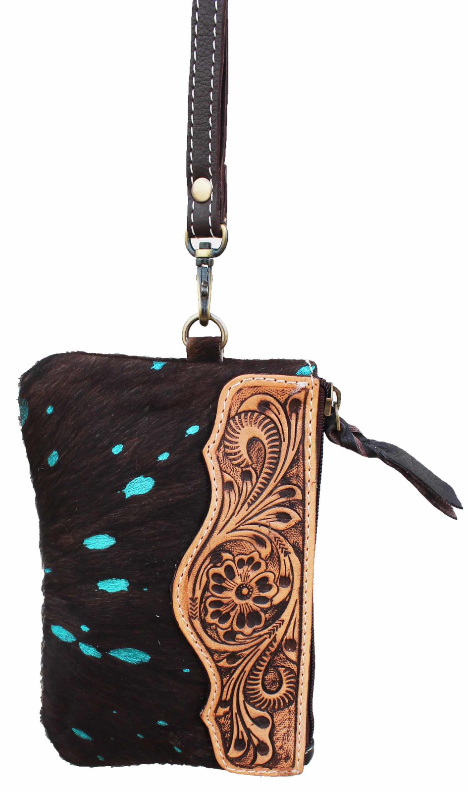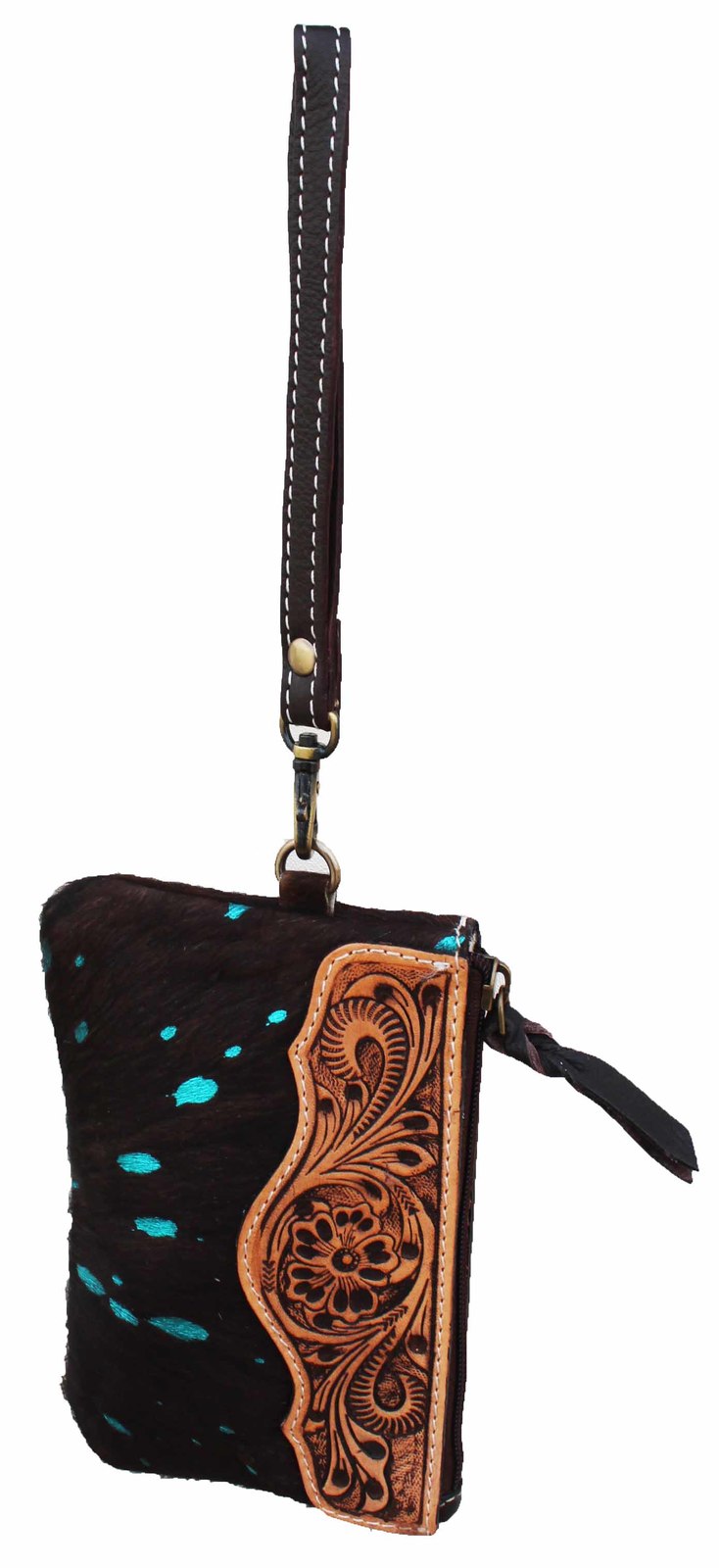 Challenger women's turquoise acid wash hair-on wristlet bag. Top zipper closure bag comes fully lined. Beautifully accented with floral hand-tooled leather, and antique brass hardware. Bag measures 7-1/2" long x 5" tall. Versatile bag provides room for quick on the go essentials such as phone, keys, credit cards. Cowhide is a natural product, each bag may vary slightly in shading, or color making each item a unique product.?
