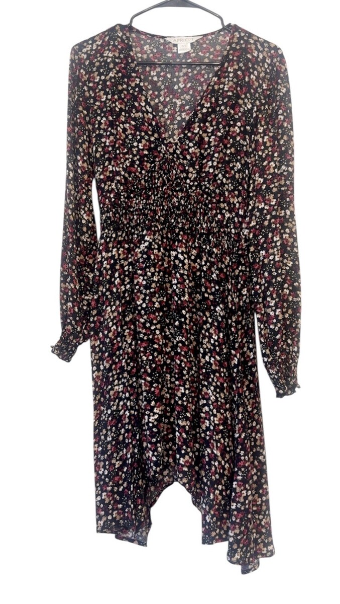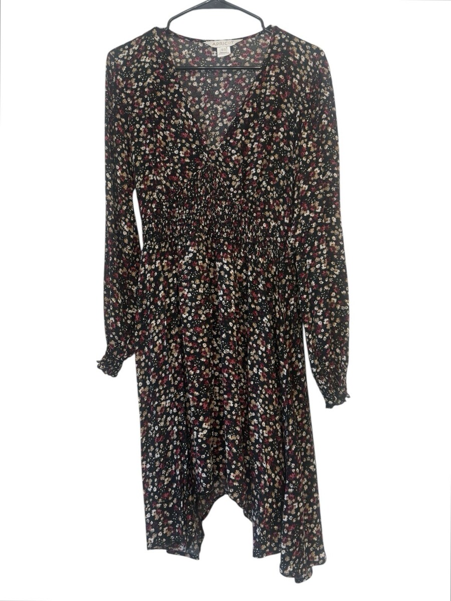 - Women’s Apricot Black Floral Smocked Dress, Size 8