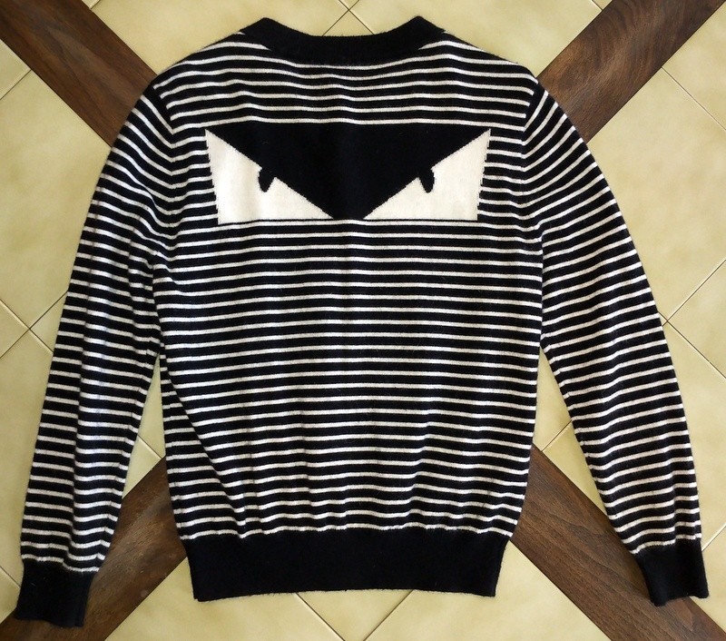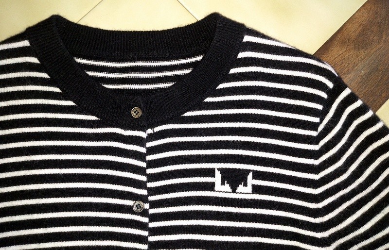 Cardigan has seven buttons down the front, ribbed trim and a unique design on the back. The knit is cozy and the fit is slim (please check the measurements as this runs small for a size L). The brand name tag has been removed so I'm not sure who the designer is.
