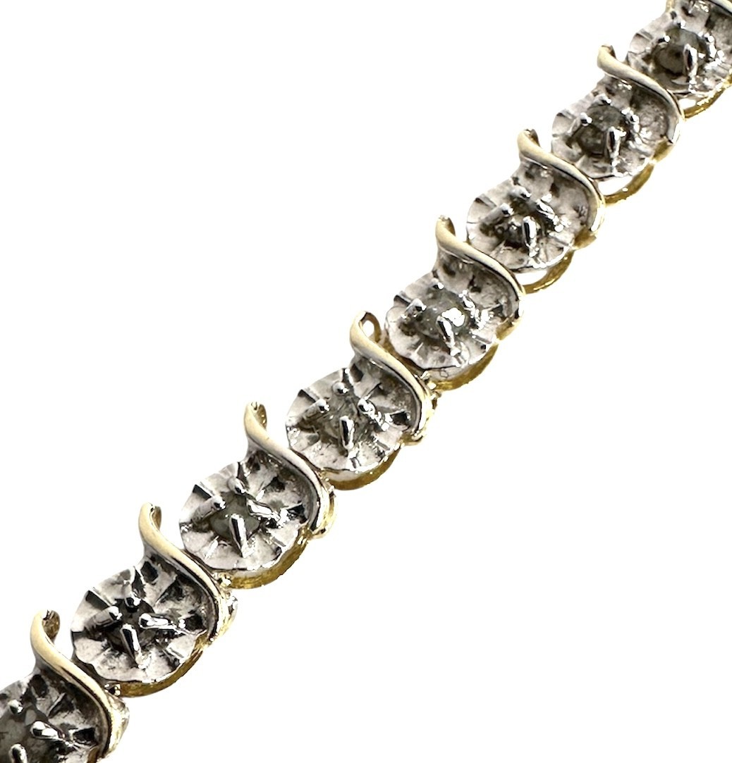 Type: BraceletWeight: 3.4Karat: 10ktMetal: Yellow and White GoldGender: Women'sStyle: TennisSize / Length: 7"Owner applied: 10ktStone 1 quantity: 35Stone 1 shape: RoundStone 1 color: ClearStone 1 weight (total): .35Condition:Used