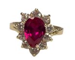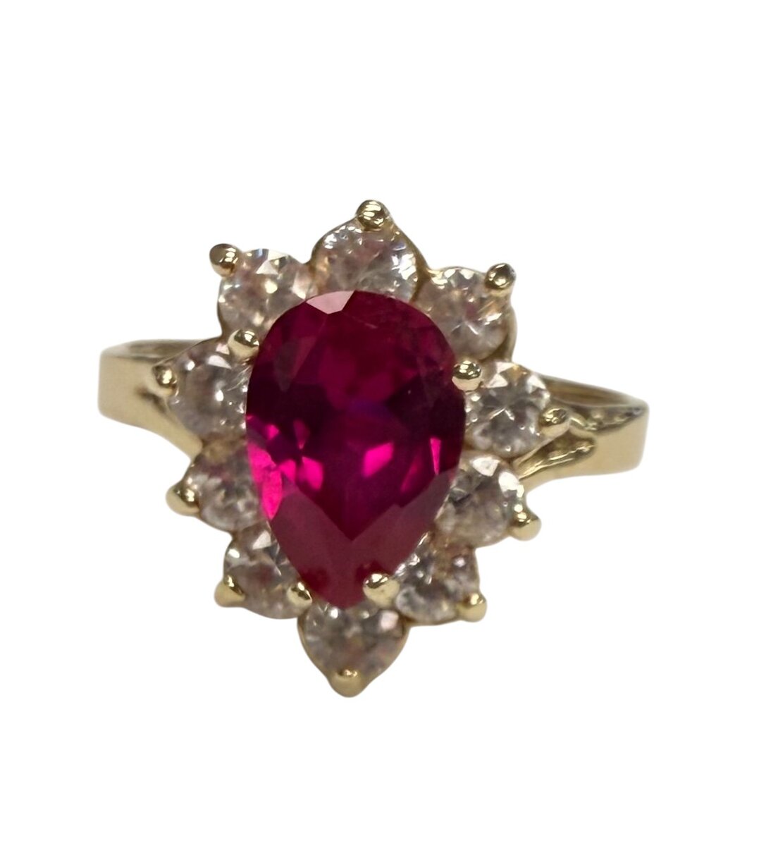 Type: Cluster ringWeight: 2.4Karat: 14ktMetal: Yellow GoldGender: Women'sStyle: ClusterSize / Length: 7Owner applied: 14kStone 1 quantity: 1Stone 1 shape: PearStone 1 color: RedStone 1 weight (total): 1.0Stone 2 Quantity: 10Stone 2 Shape: RoundStone 2 Color: ClearStone 2 Weight (Total): .70Stone 2 Type: Cubic ZirconiaCondition:Used