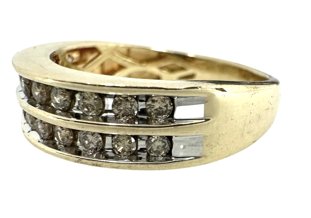 Type: Cluster ringWeight: 2.5Karat: 14ktMetal: Yellow and White GoldGender: Women'sStyle: ClusterSize / Length: 8Owner applied: noneStone 1 quantity: 24Stone 1 shape: RoundStone 1 color: BrownStone 1 weight (total): .48Stone 1 type: DiamondCondition:Used