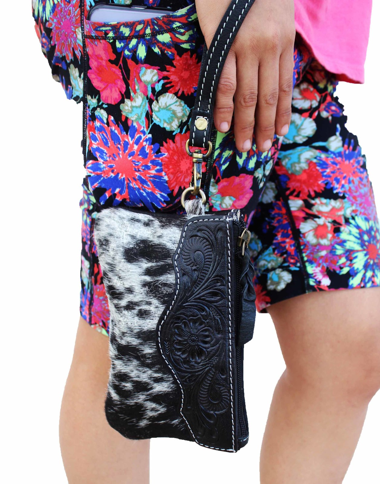 Challenger women's cowhide wristlet bag. Top zipper closure bag comes fully lined with tan canvas. Beautifully accented with floral hand-tooled leather on both sides, and antique brass hardware. Bag measures 7-1/2" long x 5" tall. Versatile bag provides room for quick on the go essentials such as phone, keys, credit cards, passport, makeup, etc. Cowhide is a natural product, each bag may vary slightly in shading, or color making each item a unique product.?