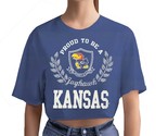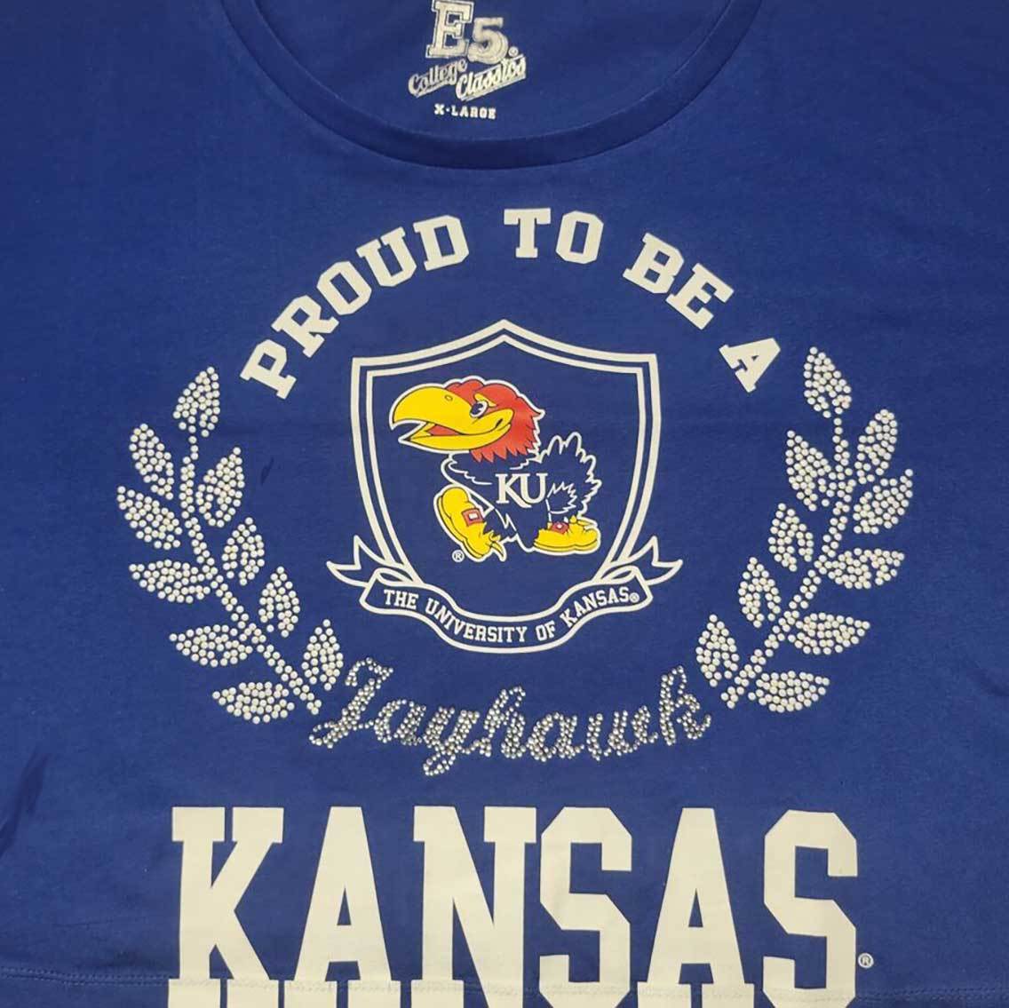 This women's E5 College Classics University of Kansas crop top showcases the UK Jayhawks logo. The cropped blue shirt has short sleeves and a crew neck design. The team's moniker "Jayhawks" is adorned in dazzling bling, with "Proud to be Kansas printed prominently.
