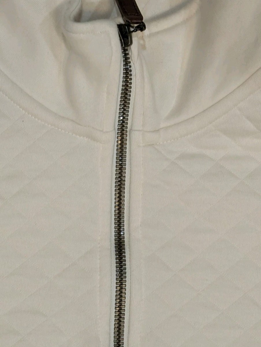 This is a beautiful woman's l.l Bean cream color quilted pullover sweatshirt. Has leather pull tag as well as a leather patch on the front left above the waist. Has a front hand pouch. Quarter zip style. Plush and warm! This is in excellent condition!