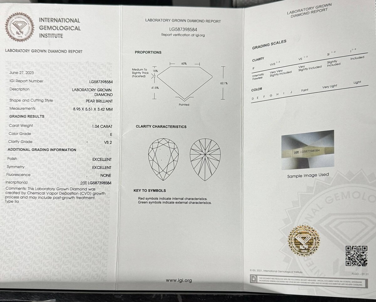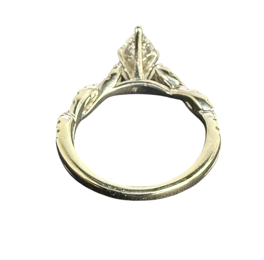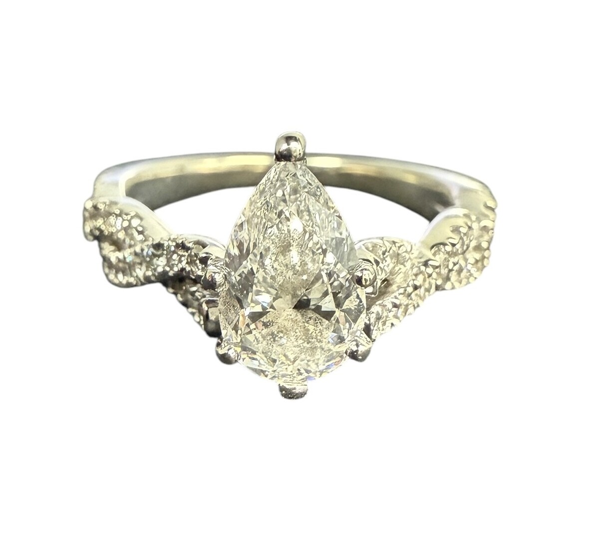 Type: Solitaire ringWeight: 2.5Karat: 14ktMetal: White GoldGender: Women'sStyle: SolitaireSize / Length: 6.5Owner applied: NaStone 1 quantity: 1Stone 1 shape: PearStone 1 color: ClearStone 1 weight (total): 1.04ctStone 1 type: Lab Grown DiamondStone 2 Quantity: 32Stone 2 Shape: RoundStone 2 Color: ClearStone 2 Weight (Total): 0.32Stone 2 Type: Lab Grown DiamondCondition:Used
