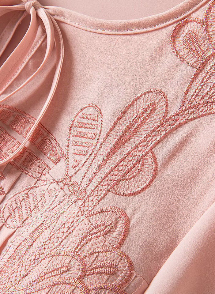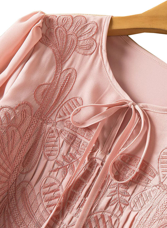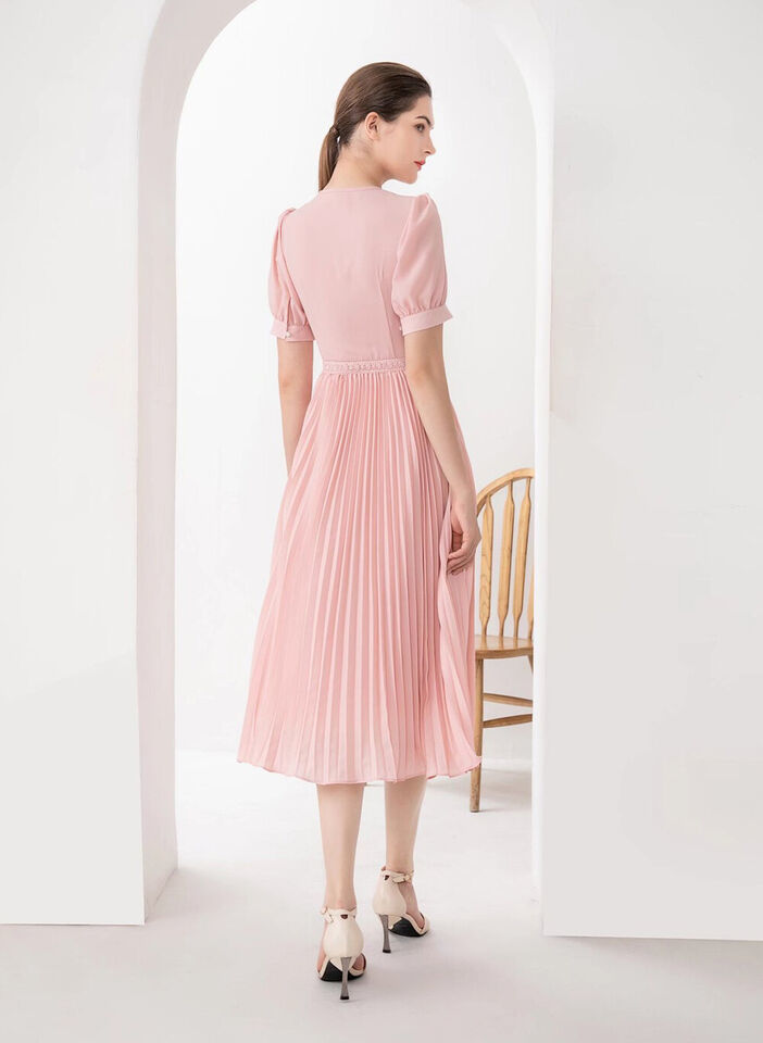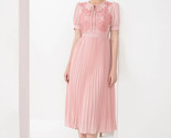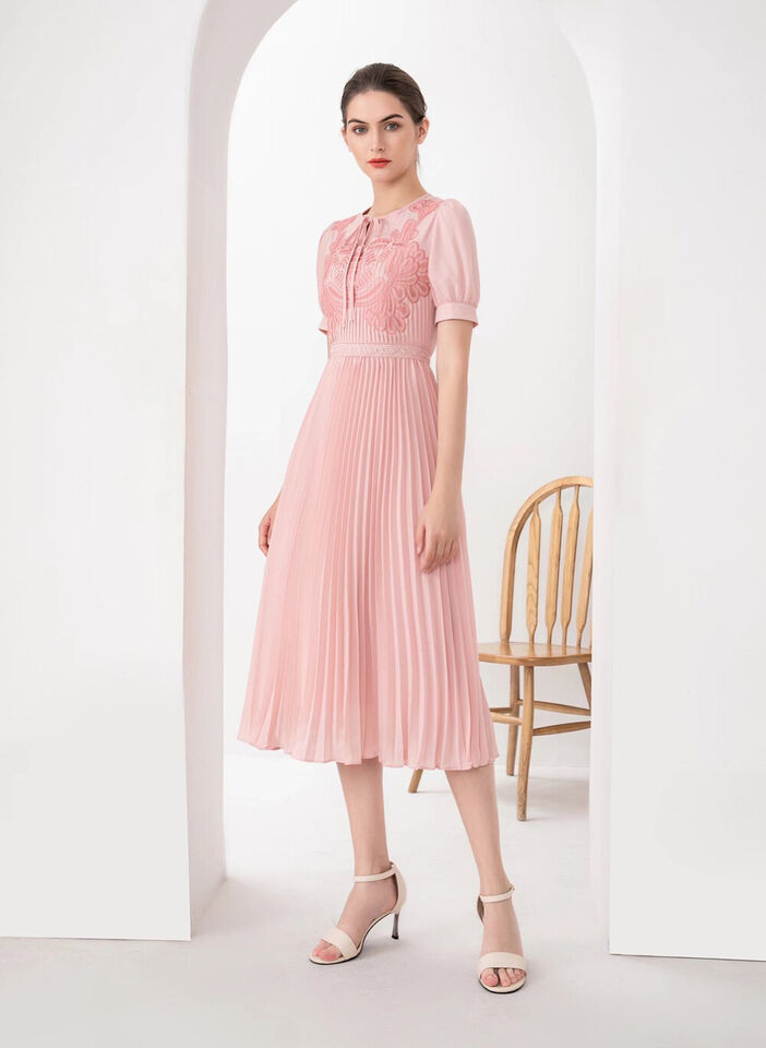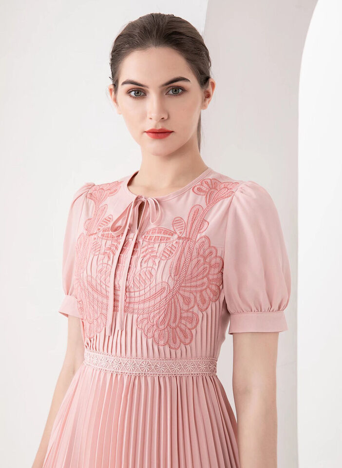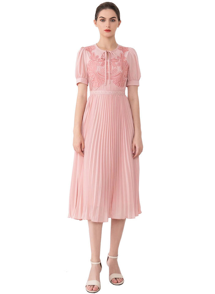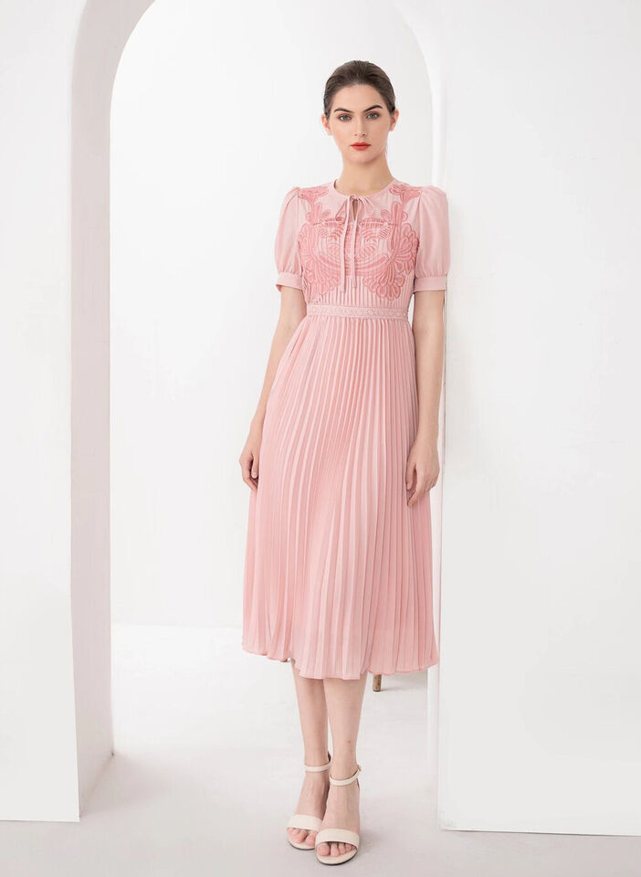 - Women's Tie-neck Embroidered Puffy Cotton Pleated Midi Dress in Pink AUS STOCK