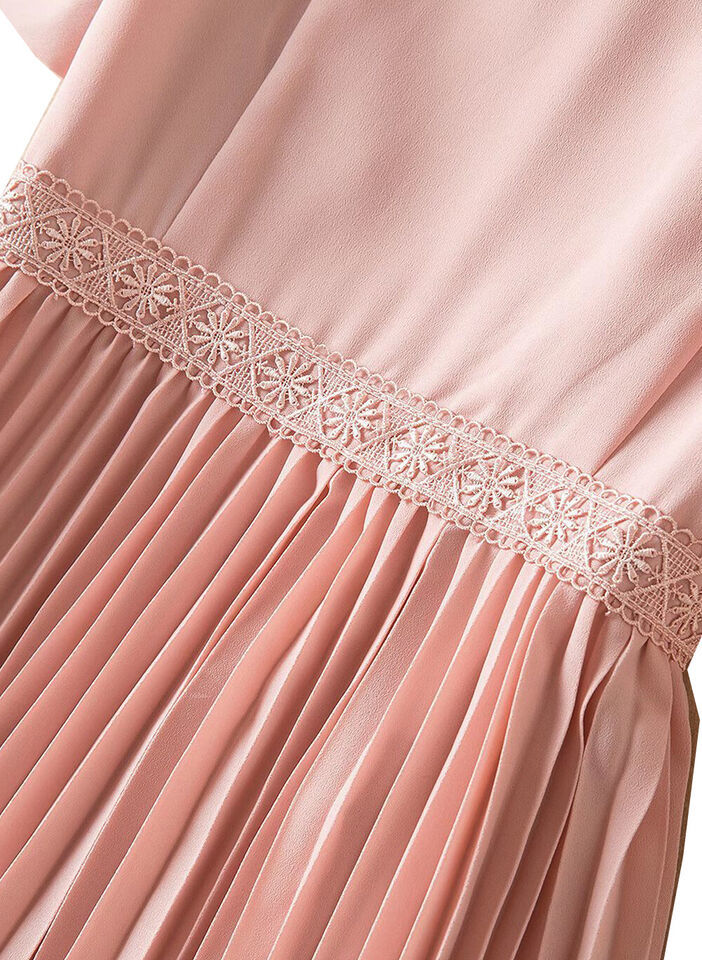 Women's Tie-neck Embroidered Puffy Cotton Pleated Midi Dress in Pink AUS STOCK