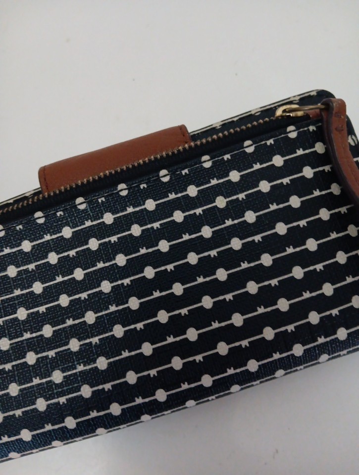 The women's vintage Fossil leather wallet features a black and white striped key design with card slots, perfect for those who appreciate retro style. Made of leather and sporting the Fossil logo, this wallet is both stylish and functional. The snap closure adds a secure touch to this one-size accessory, making it a practical choice for women looking for a unique and classic piece to enhance their everyday look. Normal wear. See Pictures.