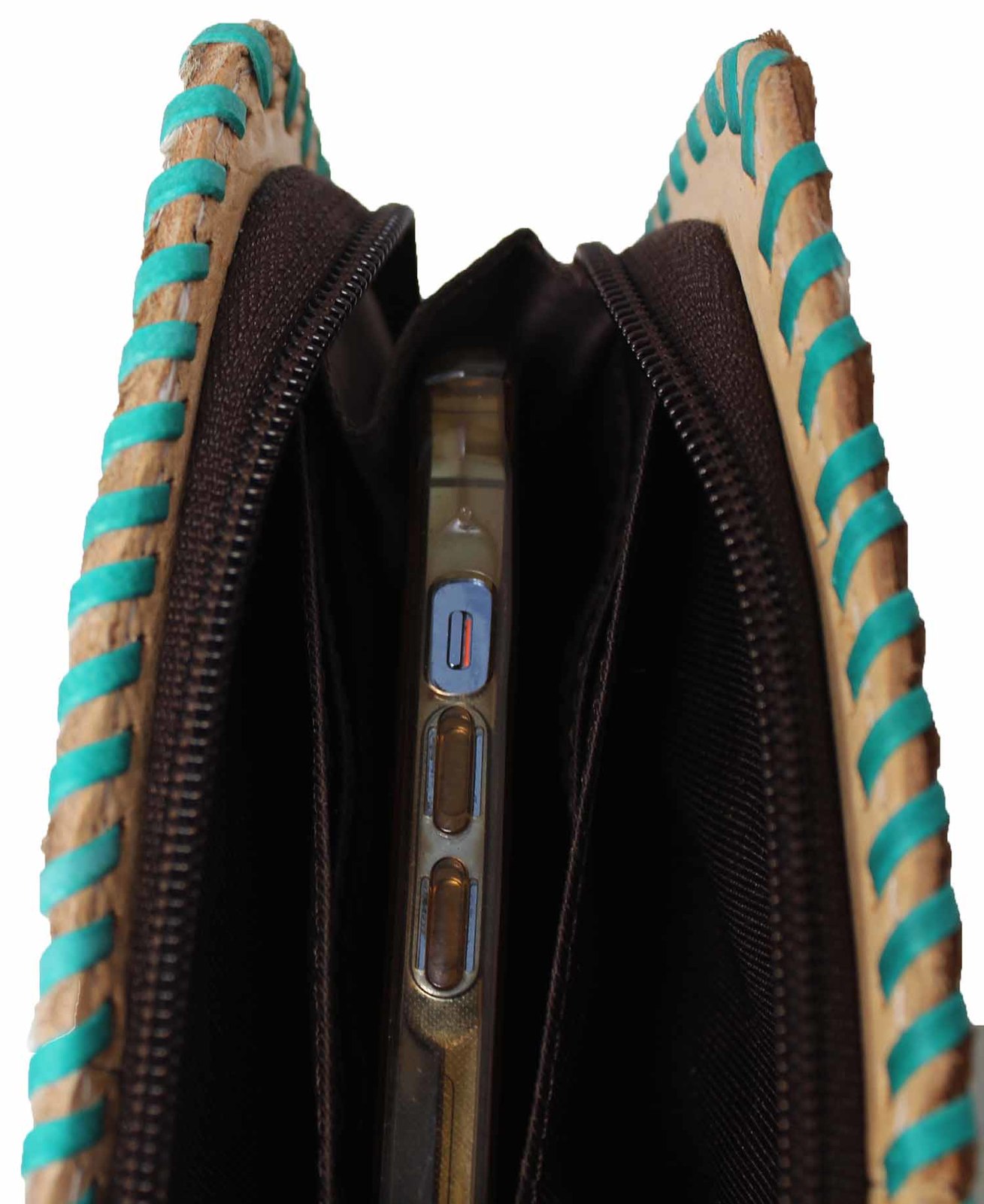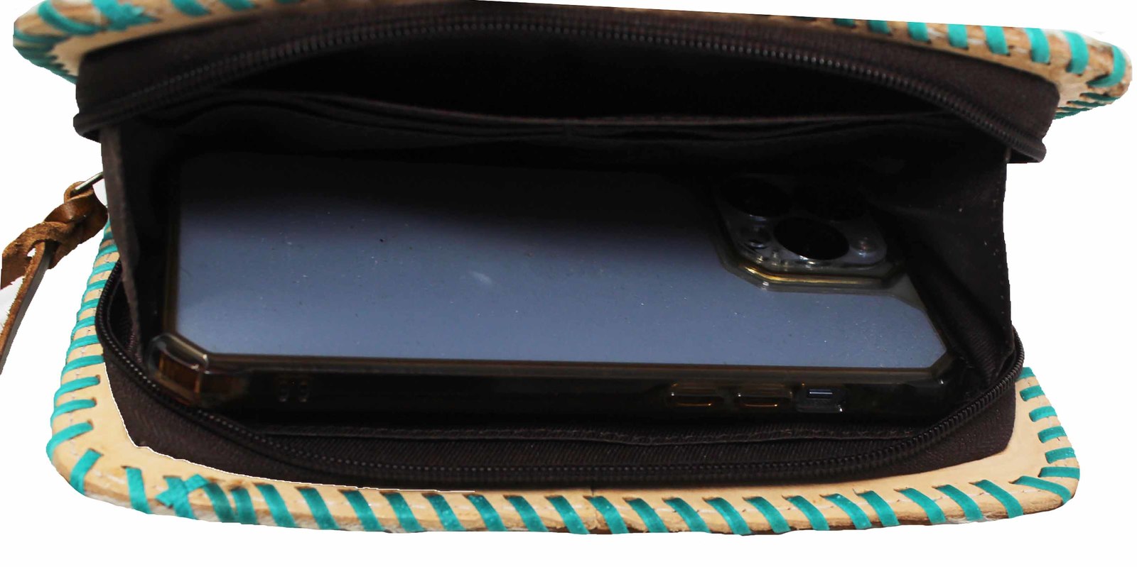 Challenger women's western wallet made from supple genuine full-grain leather to endure everyday use. Bag features a hand-tooled floral leather inlay, with cowhide front and back. Wallet is beautifullly accented with turquoise stones and laced edges. The full zippered closure main compartment comes fully lined with black canvas. Interior offers two pockets with eight credit card slots. Cowhide is a natural product, each bag may vary slightly in shading, or color making each item a unique product.? Bag measures 8-1/4" L x 5" W.
