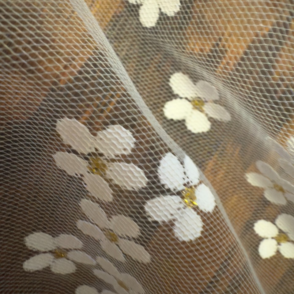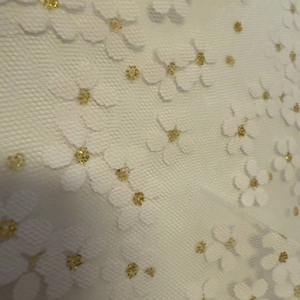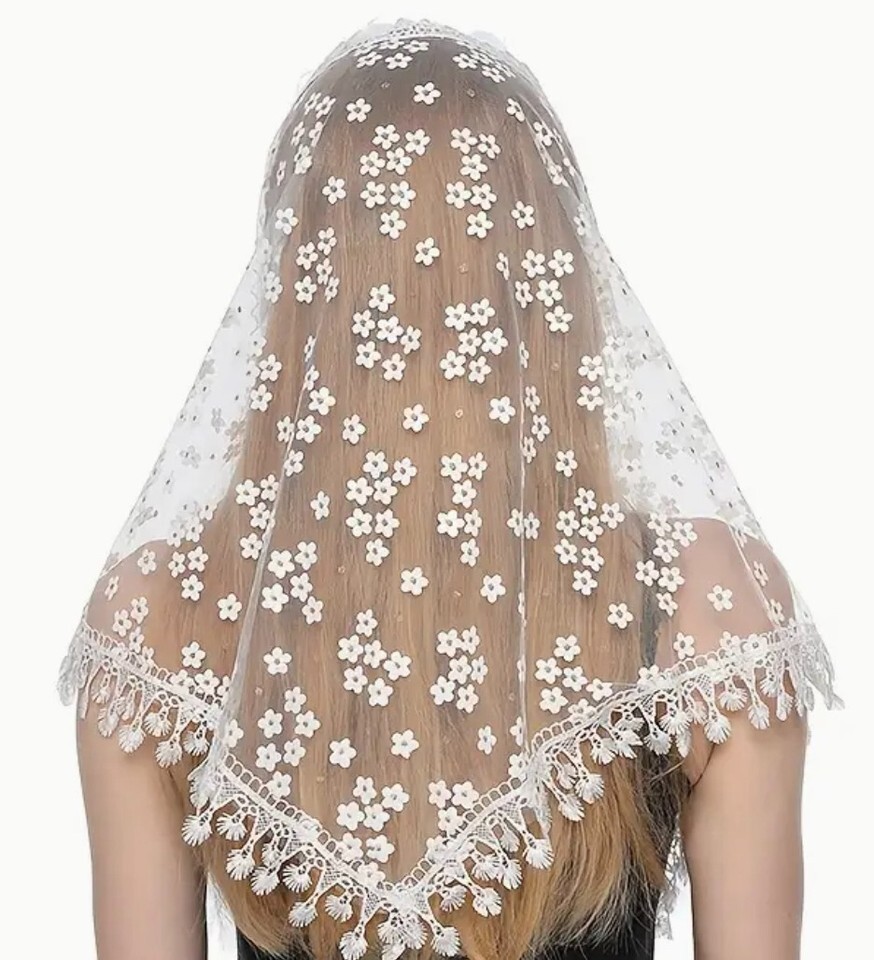 You are purchasing a very nice white church veil, that comes with this dainty floral pattern with gold accents in the center of the flower. It's a perfect size and easy to wear.