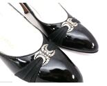 Womens vintage 1950s shoes, from Martinique, Franklin Simon. These were never worn! The patent leather is as shiny as the day they were born, and they have pretty satin pleated ribbons with silver filigree and rhinestone accents on the upper. They have leather soles, and you can tell these were expensive when new.