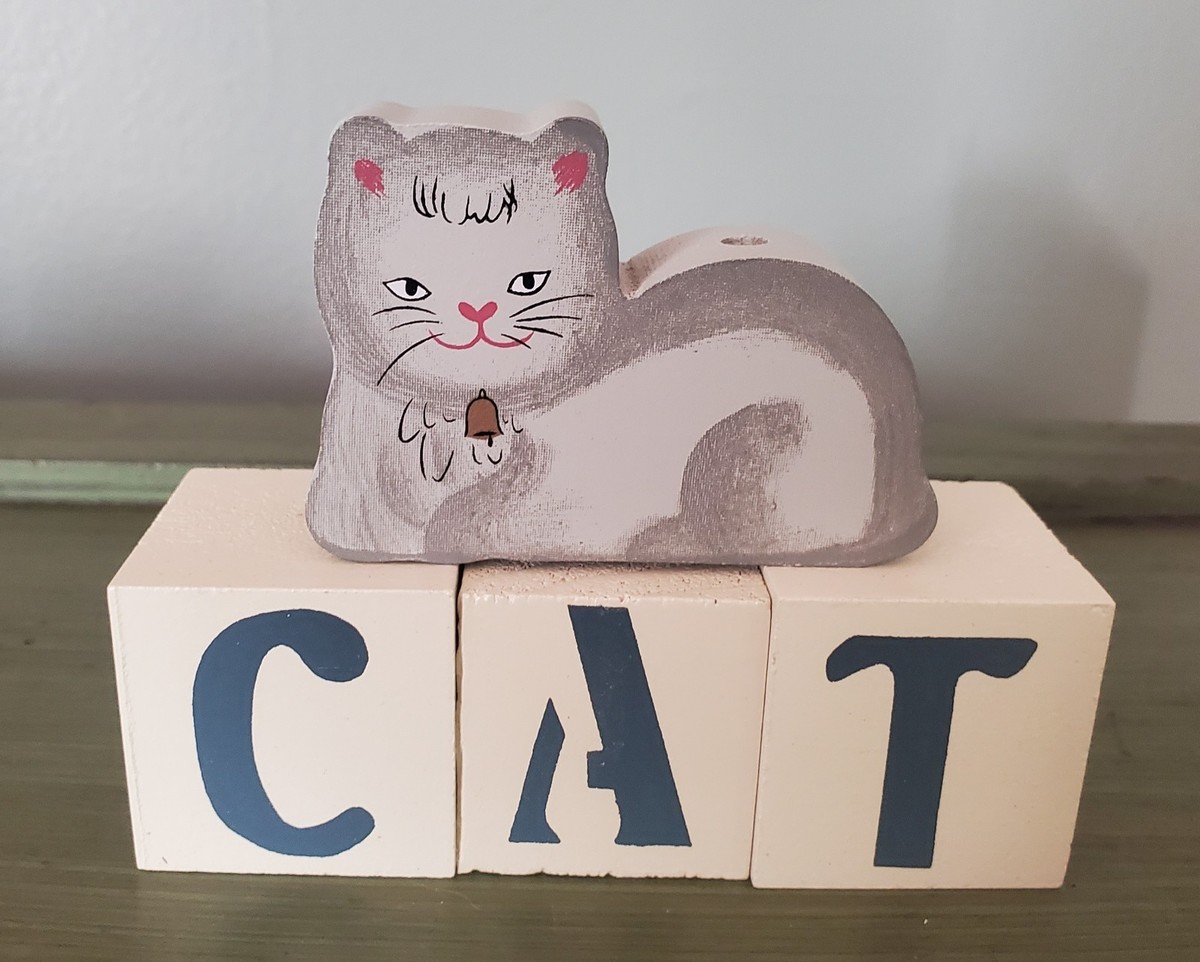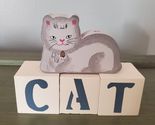 Cute handmade cat wood cut out sitting on blocks that spell out cat. The cat has a hole at the top of its back, not exactly sure what it would be used for.