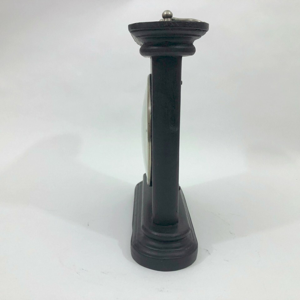 Unbranded wooden shelf clock stands 11 inches tall by 10.75 inches wide and 3.5 inches deep not counting the handle on the top. The clock face is 6 inches in diameter with Roman numerals. Uses 1 AA battery not included.