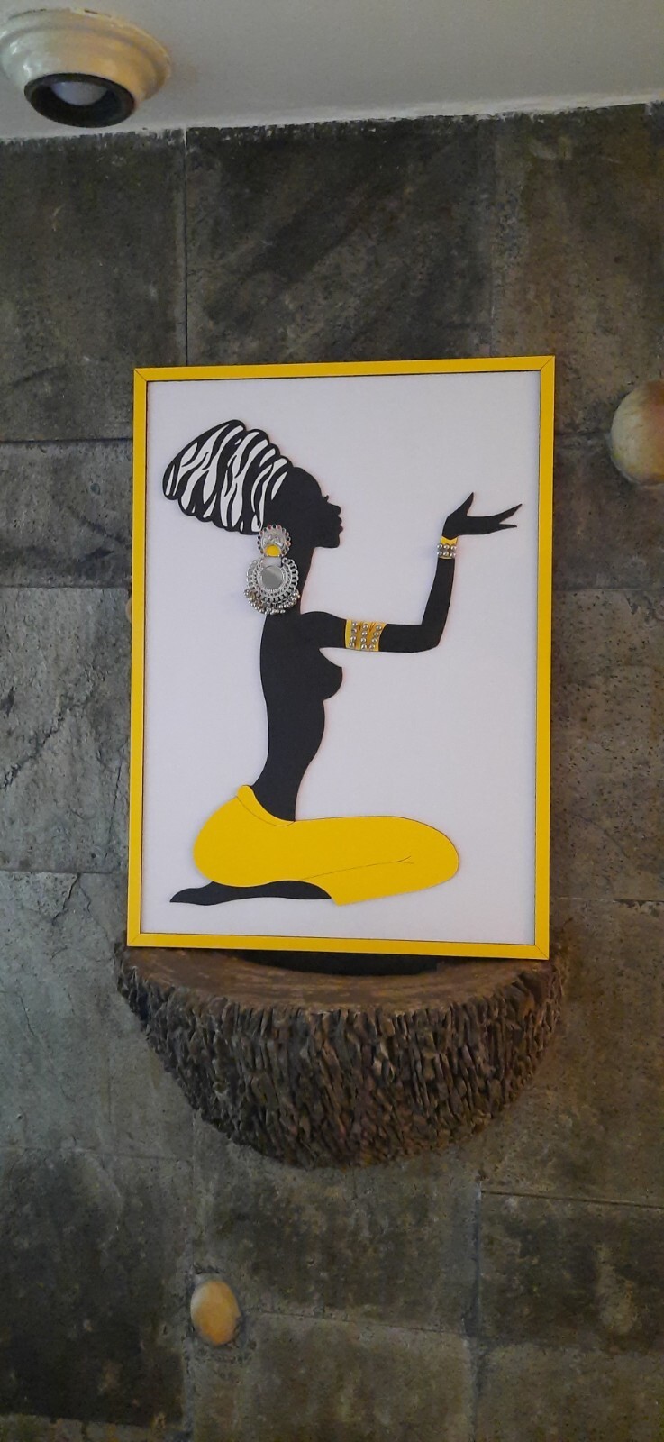 Immerse your living room and bedroom space in the rich allure with this captivating wooden wall art piece. A gracefully depicted Indian African lady, seated in serene repose, commands attention with her poised demeanor. The intricate details of her attire showcase the fusion of tradition and artistry, as she dons exquisite Indian earrings that dangle gracefully, catching the ambient light in a dance of shadows. The subtle black and yellow color palette enhances the elegance of the composition, providing a harmonious backdrop. Adorned with ornate bangles, her ensemble radiates a timeless charm that seamlessly blends with any home decor.