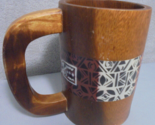 Description: Very nice hard to find mug. 5"H x 5"W (inc. handle) x 3.5"D. Large handle. Tribal band across middle with Voodoo and African Tribal masks images. Solid wood. White, black and red images on medium/dark wood mug.